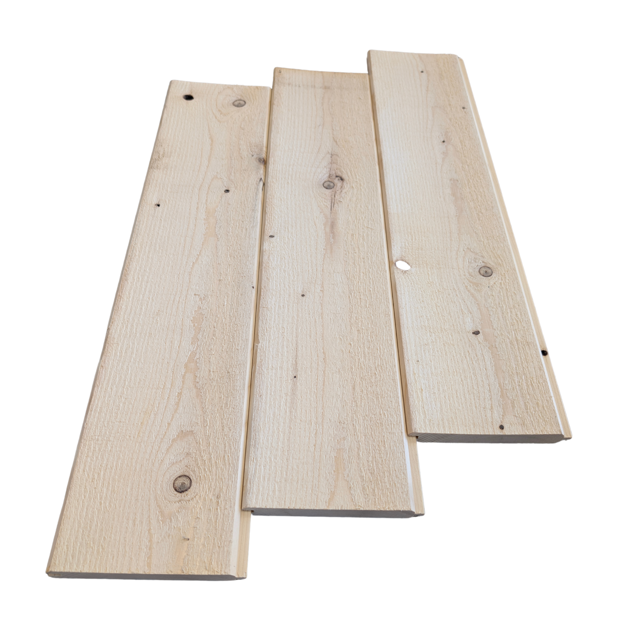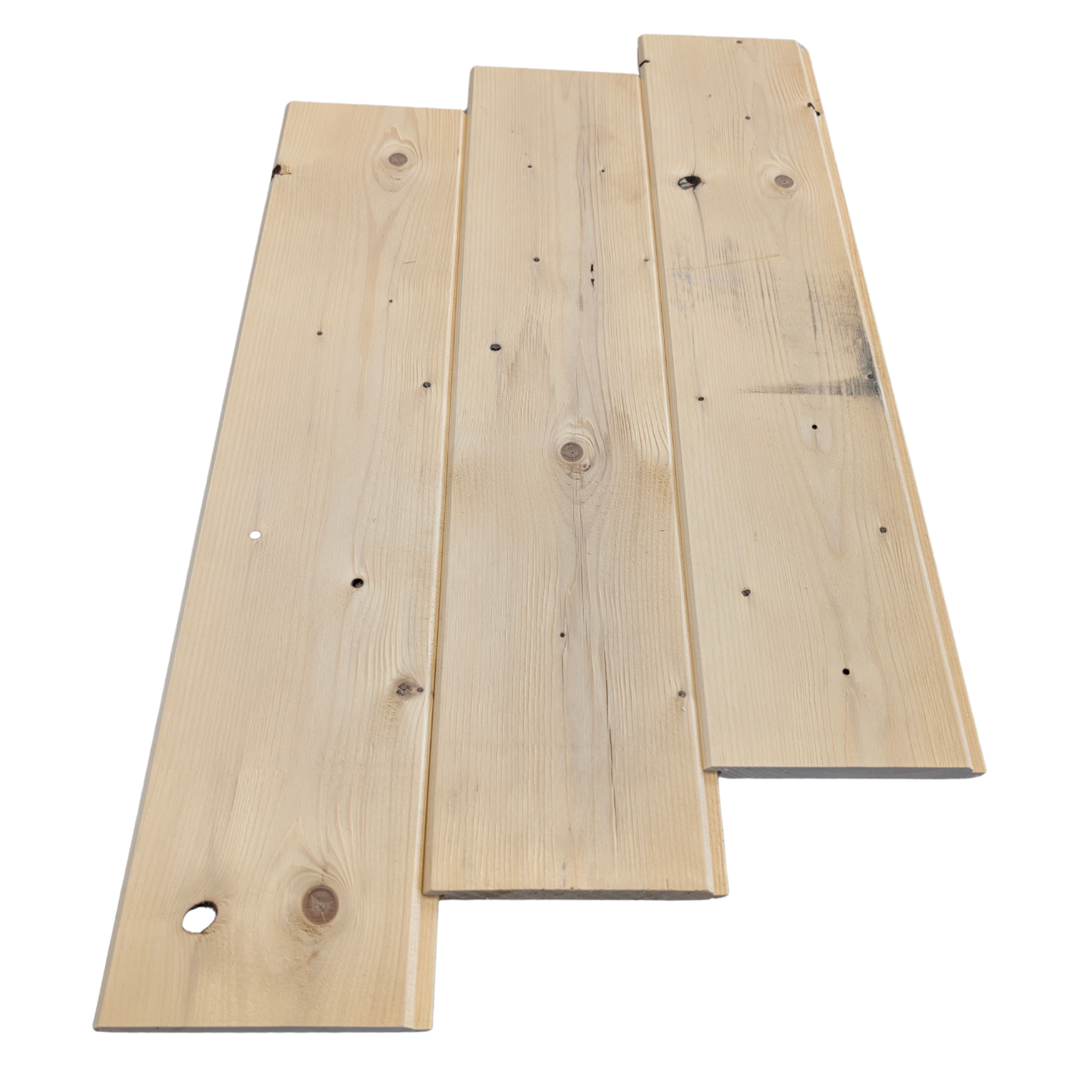 Moins épais, plus dense et bien séché, ce lambris présente des nœuds, qui peuvent être non sains et laisser des trous, mais il reste tout de même très abordable. Bien qu’il soit moins recommandé pour les projets intérieurs, sa pose nécessite une certaine habileté. Son aspect brut, avec ses imperfections, apporte une touche rustique, et sa teinte naturellement plus claire, presque blanche, s’intègre parfaitement dans des décors contemporains.